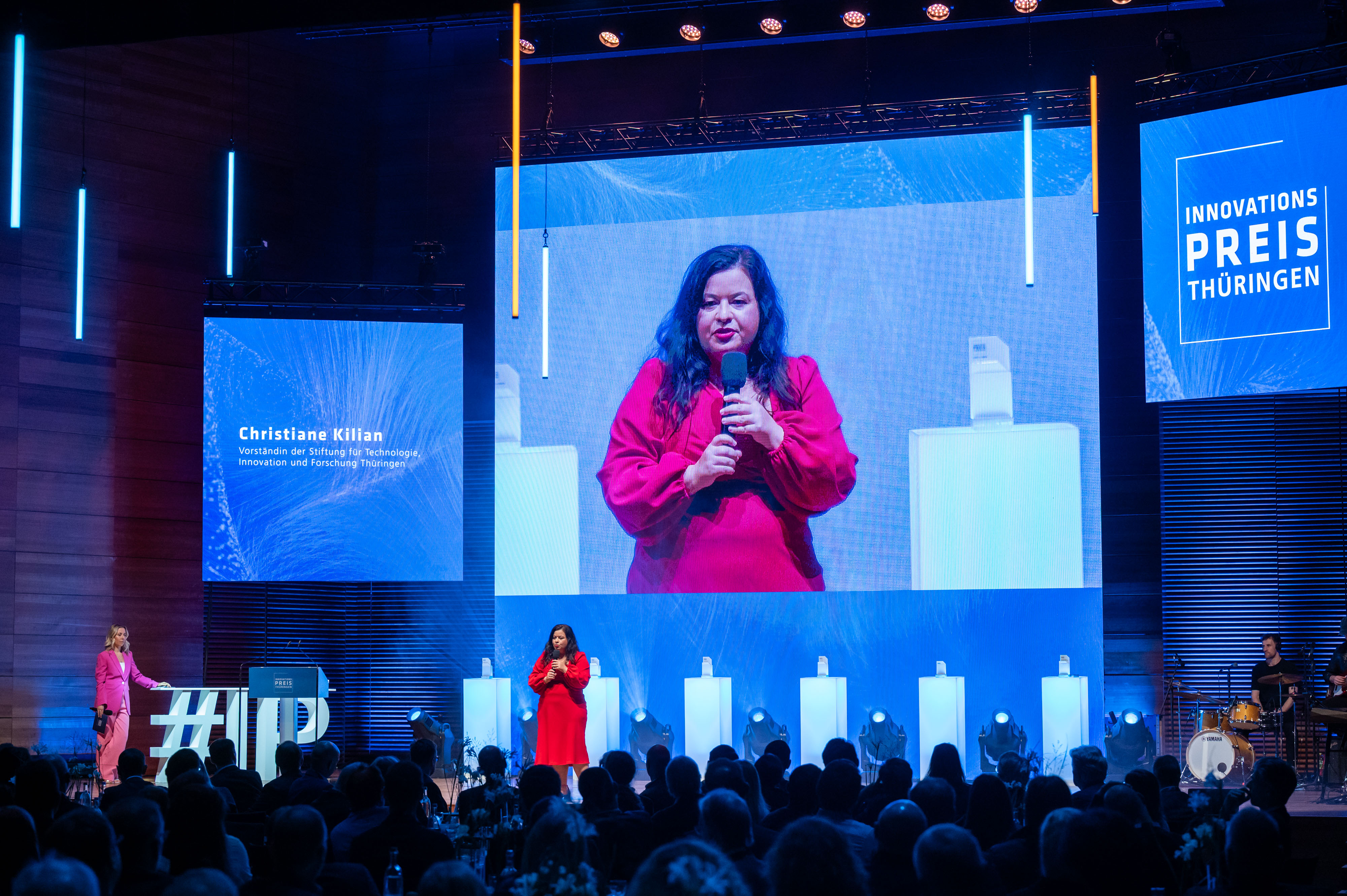 Christiane Kilian, Vorständin der Stiftung für Technologie, Innovation und Forschung Thüringen verdeutlichte die Bedeutung des Thüringer Innovationsökosystem: „Innovation entsteht dort, wo Menschen, Ideen, Wissen und Geschwindigkeit aufeinandertreffen. Der Innovationspreis Thüringen ist weit mehr als eine Auszeichnung: Er ist ein Motor, der Austausch, Mut und Zusammenarbeit antreibt. Er zeigt, wie kraftvoll unser Netzwerk aus Wirtschaft, Forschung und Politik ist und wie wir gemeinsam Zukunft gestalten.“
